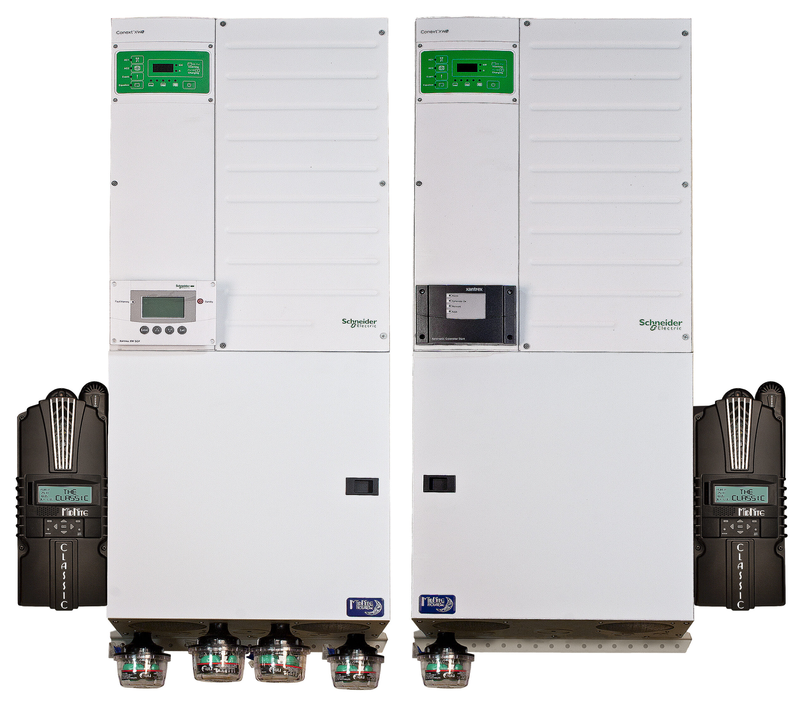 Unbound Solar’s pre-wired Schneider XW PRO 6848 power center comes wired and tested, ready to install with just a few final connections. It comes equipped with (2) Schneider Electric XW PRO 6848 sinewave inverters and (2) MidNite Classic 150 charge controllers installed on a MidNite E-panel and back plate.